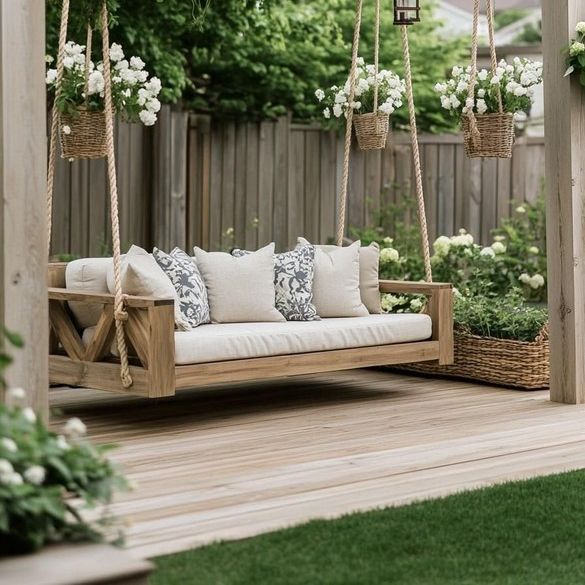 Сейчас мы уже готовы похвастаться большим спектром работ в наших материалах: подушки для садовой мебели и лежаков, качели, беседки, портьеры на террасах, оформление пляжных зон и зон у бассейна, а также многое другое.